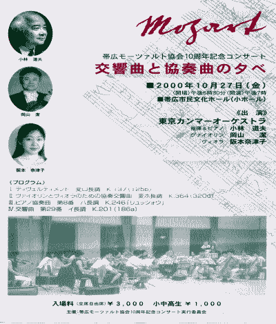 | 10月27日(金)に行われる、「帯広モーツアルト協会10周年記念コンサート」の翌日、十勝アマデウス合唱団の練習におつきあいして下さることになりました。これは、大変なことです!! レクイエムの「1曲目」を練習する予定です。 |